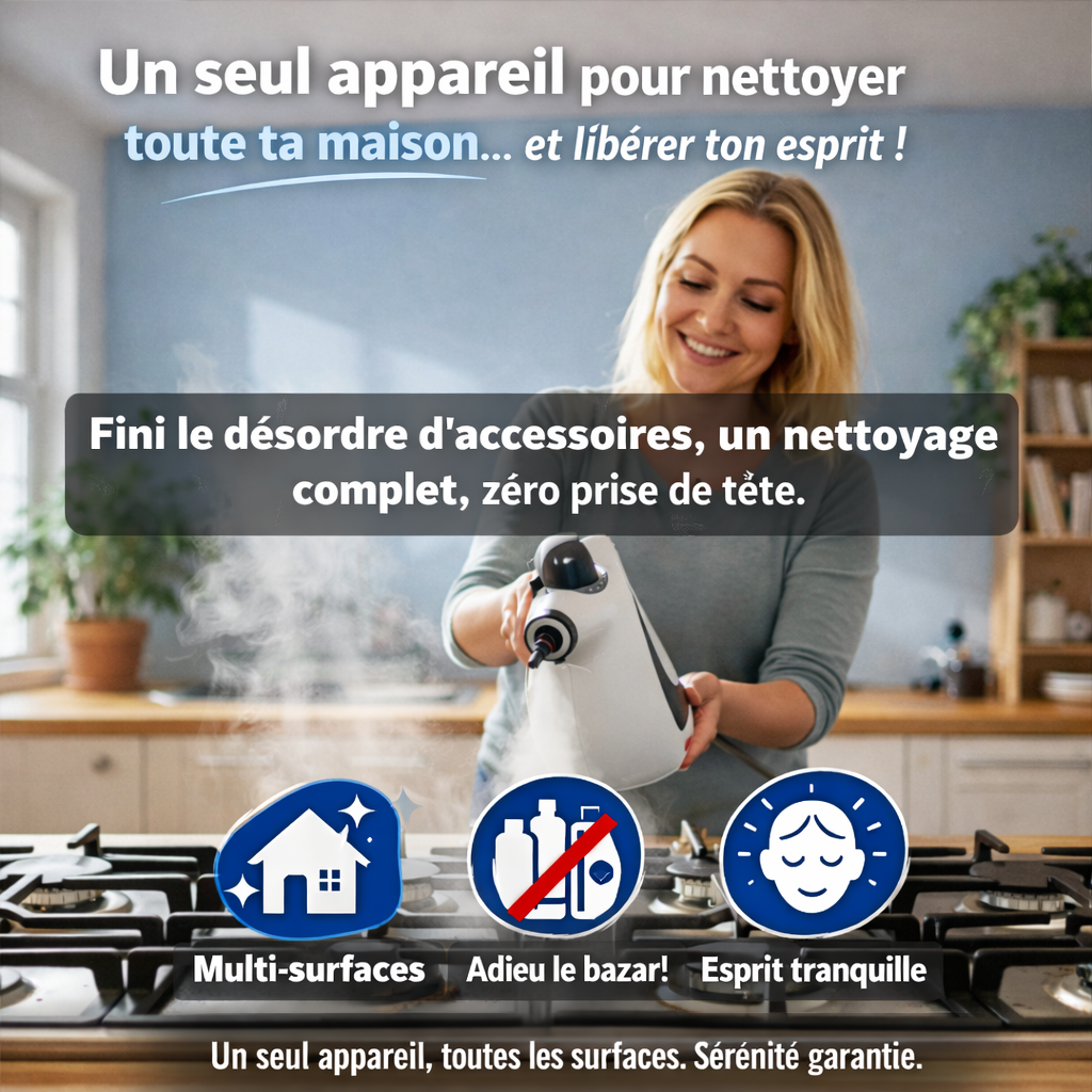 3,5 bars de vapeur haute pression. Assez puissant pour désincruster 10 ans de saleté en 3 secondes. La vapeur à 110°C combinée à 1050 watts de puissance pénètre instantanément les graisses les plus tenaces, les joints les plus noirs, les taches les plus incrustées. Sans frotter. Sans forcer. Sans transpirer. Système de sécurité intégré contre la surpression pour une utilisation sans risque.